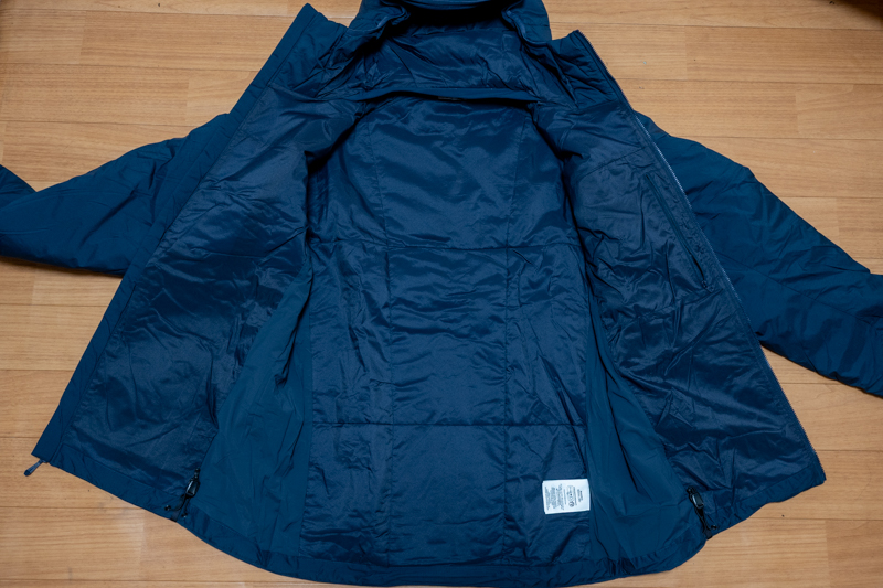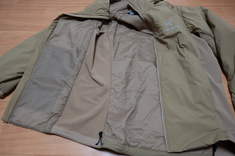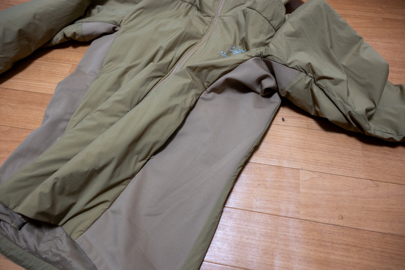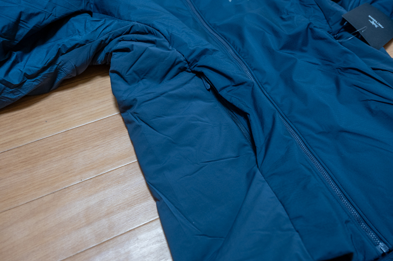 全体像を見て分かる通り,アトムSVとの大きな違いの一つは,サイドパネルがフリース素材になっていることだ.このおかげで通気性が上がっており,より行動中に熱を逃がしてくれる.また,中綿素材の量もかなり異なっている用で,アトムSVを触ったあとにアトムを触るとペラペラに感じる.アトムSVとは使い分けが重要だ.