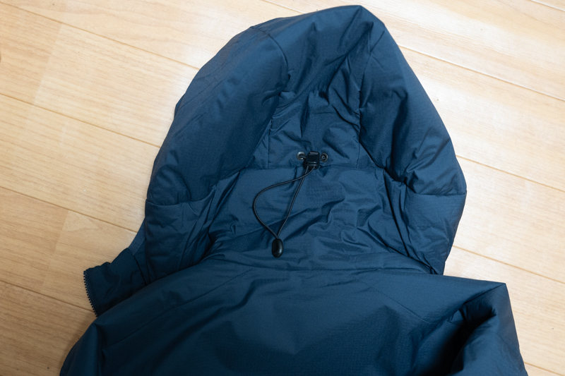 フード部分の後ろ側にもドローコードがついており,フードの調整が可能だ.アークテリクスのフードはヘルメット対応のため大きく作られており,このドローコードの調整で頭にフィットさせられる.
